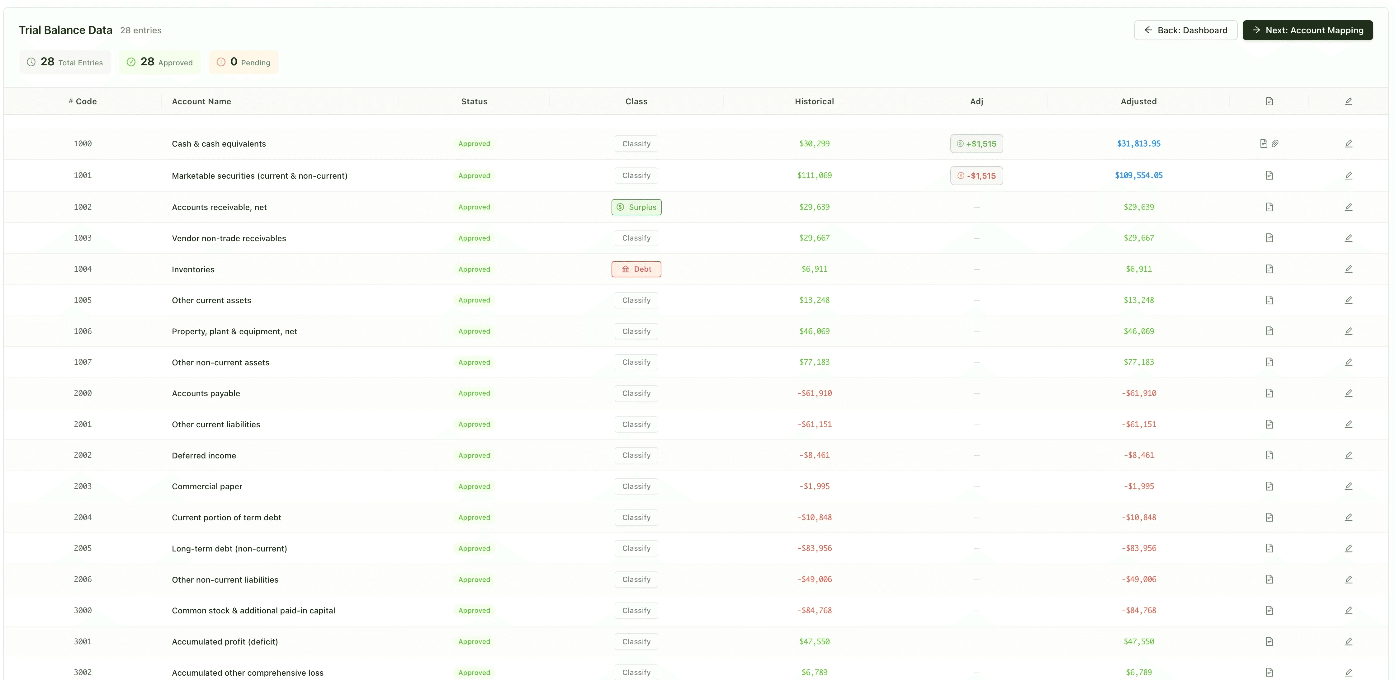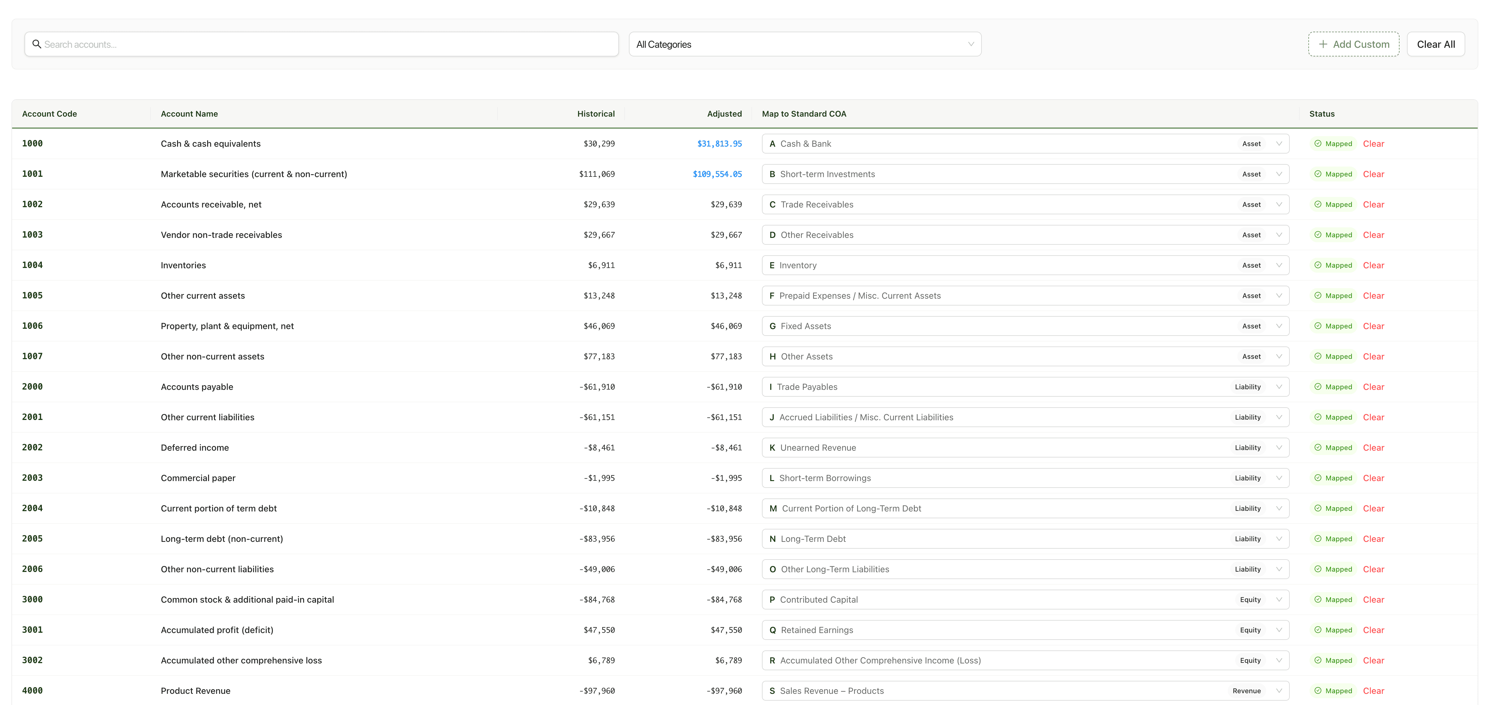 Importez ou copiez-collez votre plan comptable : Clervue normalise les libellés, apparie automatiquement et détecte les doublons, comptes orphelins et incohérences. Gérez les cas complexes (regroupés/dégroupés, BV cumulées vs non cumulées, multi-entités, multi-devises), puis validez. Les changements se propagent instantanément aux états financiers, projections et valorisation, avec exports CSV, PDF et Excel.